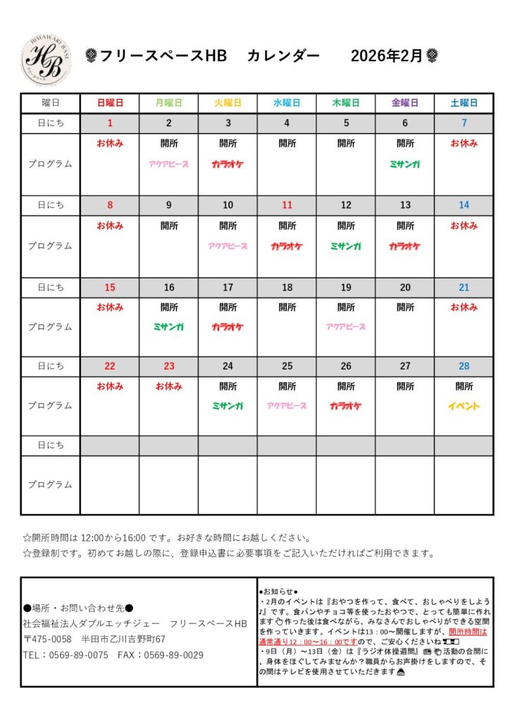 HIMAWARI BASE 2026年2月のカレンダーになります。